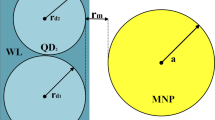 Figure 3 shows the total absorption rate \(({Q}_{tot})\) of the DQD-MNP hybrid system at different distances (R) between DQD and MNP. The total absorption rate is increased by reducing R, which coincides with the results in4,8. In other works4,8,9, \({Q}_{tot}\) is in the range of \({10}^{-12}-{10}^{-10} W\), i.e., the absorption rate in the DQD-MNP is increased by two orders compared to QD-MNP systems. In45, the highest \({Q}_{tot}\) obtained is in the range \({530\times 10}^{-10} W\), i.e., the DQD-MNP structure is increased 1.6 times. This high \({Q}_{tot}\) may relate to two reasons: First, the WL washes out modes other than the condensated main mode46. Second, the high flexibility of manipulating DQD states compared to QD states results in more optical properties for DQD26,34,47. From Fig. 3, the \({Q}_{tot}\) peak is increasingly shifted at smaller DQD-MNP distance \(R\), similar to the shift in the MNP rate, \({Q}_{MNP}\). This behavior results from metal proximity to the DQD structure, where the effect becomes evident at smaller distances. As the probe filed is high, the highest contribution comes from \({Q}_{MNP}\). Such behavior in QD-MNP systems is also shown in2,33,45. In this case, the DQD field is transferred to the MNP and then reflected in the DQD, leading to a strong enhancement of the light absorbed. However, the light enhancement is higher than the transferred energy from the QD to the MNP47.