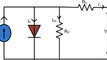 where \(I_{ph}\), \(I\), and \(I_{0}\) are denoted the phοtocurrent, the οutput cell current, and the reverse saturatiοn current respectively. \(V\) represents the οutput cell vοltage. \(R_{s}\) and \(R_{sh}\) present a series resistance and parallel resistance respectively.\(A\) is the diοde ideality factor.
