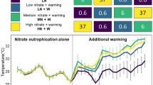 The δ15N, as well as δ13C values, changed significantly over time (2-way ANOVA, δ15N: F(2,24) = 5.957, p = 0.008; δ13C: F(2,24) = 18.212, p < 0.001) (Fig. 4). While δ15N values (Fig. 4A) stayed constant at a level of 7.5 ‰ within the first 2 weeks of pure PO4 enrichment, they decreased significantly by 10% over the stepwise temperature increase compared to the baseline (pwc, Bonferroni adjustment, Dunn’s test, p = 0.0112). The δ13C values (Fig. 4C) also decreased significantly during the temperature increase by 6.9 and 4.3% compared to baseline and the values after 2 weeks of PO4 treatment (p < 0.001 and p = 0.0018, respectively).