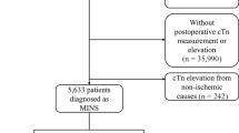 Following the current diagnostic criteria, MINS was defined as a peak cTn level above the 99th percentile of the upper reference limit within 30 days after surgery2,7. Elevation of cTn with a definite non-ischemic cause such as pulmonary embolism, sepsis, cardioversion, chronic elevation, or atrial fibrillation was not regarded as MINS. Active cancer was defined as a histologic confirmation of malignancy within six months before surgery30. High-risk surgical procedures were selected following the European Society of Cardiology (ESC)/European Society of Anaesthesiology (ESA) guidelines on non-cardiac surgery5.