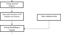 The simulation model of RETScreen contains 6 worksheets for making a simulation model of a photovoltaic project namely solar resource & system load calculation (SRSLC), energy model (EM), cost analysis (CA), financial summary and sensitivity analysis (FSSA), and greenhouse gas emission decrease analysis (GHG Analysis) in the simulation workbook file. The EM worksheet has a facility for input variables of resource assessments like solar tracking mode, slope, and azimuth; photovoltaic input variables like type, power capacity, and miscellaneous losses; inverter input variables like efficiency, capacity, and miscellaneous losses. The worksheet of SRSLC is used to recognize the type of system for the simulation model. After considering the type of system it calculates the monthly energy load. For any PV array orientation, it estimates the yearly solar radiation on the surface of a slanted array by using the monthly values of solar radiation on a horizontal surface. The CA worksheet is used to calculate the total cost of energy projects based on the RETScreen database. The worksheet of GHG analysis is used to calculate the total yearly decrease potential of greenhouse gas emission in the unit of tCO2/year. This worksheet also facilitates the estimation of the equivalent of GHG emission in terms of cars & light trucks that are not used, liters of gasoline not consumed, barrels of crude oil not consumed, acres or hectares of forest absorbing carbon, and tonnes of waste recycled on an annual basis. The FSSA worksheet provides the financial summary and associated risk of the proposed energy project along with the facility of input variables like escalation rate of fuel cost, rate of inflation, rate of discount, reinvestment rate, and life of a project. The EM & SRSLC worksheets should be completed first. After that, the worksheet of the CA should be completed and finally, the FSSA worksheet has to be completed. This sequence of the process could be repeated several times to achieve an optimum design for the photovoltaic project according to the use of energy and cost point view42. The energy model flow chart for the photovoltaic project is presented in Fig. 2. The fundamental equations for the calculation of all six worksheets have been provided in the appendix proofs (Supplementary Information).
