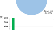 The collected anopheline mosquitoes were identified by groups or species under a stereomicroscope based on the pictorial identification key14. For some groups that have a species complex, the mosquitoes were identified up to the group level. The gonotrophic status of the mosquitoes, including unfed, blood-fed, half-gravid, and gravid, was determined. The unfed mosquitoes were observed to have no blood in the abdomen, while those that were fed blood were partially or fully engorged with red blood. The dark red colour of blood covering 3–4 segments and the ovaries/eggs covering the rest of the mosquito abdomen were assigned as half-gravid, while the gravid mosquitoes were blood-free and the ovaries/eggs covered almost all of the abdomen35. Anopheline mosquitoes were dissected using a 26G and ½ inch-long sterile needle to separate salivary glands (head and thorax parts) from the midgut (body part). Additionally, 0.1% mercurochrome dye was used to stain sporozoites in salivary glands, after which samples were examined under a microscope at 1,000 times magnification.