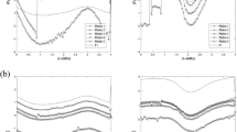 Here, the quantities \({A}_{n,l}\left({k}_{n}\right)=\frac{{F}_{n}^{(l)}}{{\omega }_{0,n}^{2}\left({k}_{n}\right)-{\omega }_{l}^{2}}\) are now real. The star in Eq. (27b) stands for the complex conjugate. For the sake of simplifying the notation, we have dropped here the different labelling of the same wave numbers \({k}_{n}\) and \({k}_{n}^{^{\prime}}\) used in Section “Experimental results”. The first two bracket in Eq. (27a) correspond to the solution to the homogeneous equation with \({\omega }_{0,n}\) defined in Section “Experimental results”. The second bracket correspond to the particular solution. Both brackets now include the complex solutions and their complex conjugate to account for the real nature of the displacement and the real form of the driving forces \(\mathrm{cos}{\omega }_{1}{\tau }_{0}\) and \(\mathrm{cos}{\omega }_{2}{\tau }_{0}\).