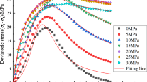 Mogi2 found that the average transition is defined as \({\sigma }_{1}=4.4 {\sigma }_{3}\), which is a convenient guide for selecting the maximum confining pressure for triaxial tests of intact rocks. Typical stress–strain curves in the brittle, the transition and the ductile state are very different (see Fig. 4). Brittle rocks break with a slight inelastic strain and a rapid stress reduction after the peak stress, which is referred to as macroscopic failure5. The rock exhibits brittle-ductile transition behavior at moderate confining pressures, with a noticeable significant inelastic strain before reaching the peak stress, followed by a slow drop in stress5,45. When confining pressures are high, the rock becomes ductile, undergoing a substantial inelastic strain up to peak stress and remaining constant46.