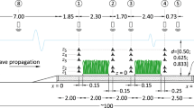 For all the simulations presented, the steady-state velocity profile \({\overline{u}}(z)\) is imposed at both the inlet and outlet, and a restoring term is applied to a buffer region at the outflow boundary (omitted in Fig. 1) for \(x\in [L,\,L_r]\). The buffer is used to suppress the vortices so the flow matches the outflow boundary condition, thereby minimizing reflections from the boundary. The bottom boundary has a no-slip condition for the velocity (\(u=w=0\)). Pressure is constant at the free-surface. In this study, we explore two-dimensional solutions by allowing no variations in the y-direction within the model.