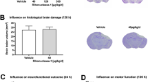 All experiments were performed and analyzed in a randomized (computer-based randomization) and triple-blinded manner. Statistical analysis was performed with GraphPad Prism 9 statistical software (GraphPad Software Inc., La Jolla, CA, USA). To determine the optimal sample size, an a priori power analysis using G ∗ Power67 was performed using lesion volume data from previously published studies24,56,60,68. The a priori power analysis for the effect size of 0.7 suggests that a standard statistical power (1 − β) of Pβ = 0.95 for a given significance level (α) of 0.05 can be obtained for lesion volume with 10 subjects per group (3 groups) and brain water content with 10 subjects per group. For 5 days of survival, the group size was expanded (n = 12/group). Prior to statistical analysis, we checked the test assumptions. Due to the limited power in small samples, we did not perform formal goodness-of-fit tests prior to the t test or ANOVA, but instead relied on the graphical assessment of distribution characteristics69. Normality was checked by using normal probability Q–Q plots and inspecting the unimodality and symmetry of histograms. The equality of variances was checked by inspecting histograms and standard deviations. For comparison of multiple independent groups, Brown-Forsythe and Welch ANOVA with post-hoc Dunnett T3 multiple comparisons test (comparisons between all groups) was employed. To evaluate group differences in repeated-measurements from the same animals (rotarod), RM two-way ANOVA was applied (factors: treatment and time), followed by Šidáks multiple comparisons test. Comparisons between two independent groups were carried out by the Welch’s t test. Values of p < 0.05 were considered significant. A significance level p < 0.05 is marked with *, p < 0.01 with **, and p < 0.001 with *** in the figures. Data are presented as the mean and standard error of means (mean ± SEM).