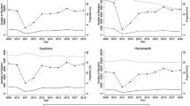 Table 1 shows the characteristics of the target population for each year between 2009 and 2018. Characteristics such as the number of residents, ages, residence statuses, and whether they were living alone, were relatively stable during the period. Regarding evacuation status, the number of people who evacuated outside the city peaked in 2011, at 43.0% (3555/8272), and consistently decreased thereafter. By contrast, those who were in states of non-evacuation, as well as those who evacuated inside the city, increased almost consistently over the post-disaster study period (2011–2018).