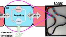 However, if the process goes in a few stages then the time \(\tau\) is essentially smaller and the fluctuations of \(\tau\) are smaller. In fact, let us represent a target string \(s^*\) as a concatenation of several strings \(s^{*,1}, ... , s^{*, k}\). Suppose for simplicity that lengths \(l(s^{*, j})\) (of \(s^{*, j}\) are equal: \(l(s^{*, j})=m^{\prime }= m/k\) and the search of \(s^{*}\) goes in a k stages. First we go to \(s^{*,1}\) by a random walk on the hypercube \(S^{m^{\prime }}\) of dimension \(m^{\prime }\). Just the process reaches \(s^{*,1}\) we fix components of \(m^{\prime }=m/k\) of the first components of s. Then we move to \(s^{*,2}\) by a random walk on the second hypercube of dimension \(m^{\prime }\), etc. All this search requires \(O( k 2^{m^{\prime }})\) steps. This means that we have an exponential acceleration by a decomposition (the results of numerical simulations are shown in Fig. A8 in SM). We define the normalized standard deviation \(\sigma (\tau )\) of \(\tau\) as \(\sigma (\tau )=E\tau /\sqrt{Var \ \tau }\), where EX and \(Var \ X\) denotes the expected value and the variation of random quantity X. Then computations show that \(\sigma (\tau ) \approx 1/\sqrt{k}\) and \(\sigma (\tau ) \approx 1\) when the process goes in a single stage. A stochastic dynamics defined by Eq. (4) can be used to make morphogenesis. The key idea is as follows. Each pattern is encoded by a genotype s. We suppose that the pattern corresponding to a viable organism (obtained by an evolution) is encoded by \(s^*\). Then we use \(s^*\) as a terminal (absorbing) state in the dynamics defined by the Master equation (4). In the next subsection, we consider the realization of dynamics (Eq. 4) and TMs via reaction-diffusion models.