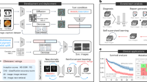 Diffusion models are a class of generative models that are defined through a Markov chain over latent variables \(x_{1} \cdots x_{T}\)30. The main idea is that starting from an image x0, the image is continuously perturbed by adding Gaussian noise with increased variance for T timesteps. A neural network conditioned on the noised version of the image at timestep t and the timestep itself is trained to learn the noise distribution employed to perturb the image. Consequently, the data distribution \(p(x_{t - 1} |x_{t} )\) at timestep t − 1 can be inferred. When T becomes sufficiently large, we can approximate p(xT) by the prior distribution \({\mathcal{N}}({\mathbf{0}},{\mathbf{I}})\), sample from this distribution, and traverse the Markov chain reversely. Thereby, we can sample a new image from the learned distribution \(p_{\theta } (x_{0} ): = \int {p_{\theta } (x_{0:T} )dx_{1:T} }\). The neural network that models the noise is typically chosen as a U-Net32, since the noised input and the denoised output must be the same size. To support 3D inputs, we replaced the 2D convolutions in the original U-Net architecture with 3D convolutions. Each block in the encoder part of the U-Net consists of convolutional layers. These layers downsampled the image using kernels of size 3 × 3 × 1 and only operated on the high-resolution plane of the 3D volume. Subsequently, spatial- and depth-wise attention layers, as proposed by Ho et al33, were implemented. The spatial attention layer leveraged the global attention mechanism by computing a key, query, and value vector for every element on the high-resolution image plane, thereby treating the depth dimension as an extension of the batch size. The resultant vectors were combined utilizing the attention mechanism proposed by Vaswani et al.34. We introduced a depth-wise attention layer to follow the spatial attention layer. This stage treated the axes of the high-resolution image plane as batch axes, thereby enabling each feature vector on the high-resolution plane to attend to feature vectors on different depth slices. The U-Net's decoder was built similarly, where convolutional layers were applied in each block, followed by spatial- and depthwise attention blocks. In addition, the image was upsampled via transposed convolutions35, while skip connections were added to the output of each block.