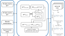 where \(m\) is the number of muscles, \(n\) is a predetermined number of basic patterns and \(W\) (\(m\times n\) matrix) correspond to weighting coefficients or muscle synergies. The \(W\) and \(P\) matrices are estimated to minimize the root-mean-squared error between the original \(EMG\) signals and those reconstructed using \(P\times W\).