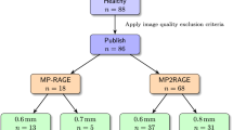 MTCSF was calculated from the images acquired in the presence of MT pulses only (SMT)41. CSF was segmented as described above and the mean signal from the CSF region was determined (SCSF). MTCSF maps were then generated by normalizing SMT images to the mean signal from the CSF region (SCSF)