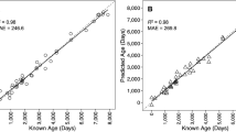 Samples were randomly assigned but stratified by age using the caret R package49 into either a training data set to calibrate the model (70% of samples) or a testing data set to independently validate the model (30% of samples). Samples were stratified by age to prevent a bias of an age class being in one data set. The fish ages for the samples that were used to calibrate the model were either daily or annual ages derived from their otoliths (Supplementary Table 1). To make best use of the available data, three independent models were generated. The first was a daily clock that was only calibrated with samples that had daily age predictions from otoliths; the second was an annual clock that was only calibrated with samples that had annual age predictions from otoliths; and the third a universal model, that incorporated all samples. An elastic net regression model with a tenfold cross validation and the alpha parameter set to 0.5 was used to identify the best CpG sites as predictors of age50. An elastic net regression model is a commonly used algorithm used in epigenetic ageing studies as it can identify the best performing predictors from potentially 1000 s of candidates50,51. Although we have already narrowed it down to 31 CpG sites, there were potentially neighbouring CpG sites that may be specific to golden perch and may improve the epigenetic clock. A separate elastic net regression model was used for each clock to make a specific model for each set of samples. A Pearson correlation was used to determine the precision of the model by using the correlation between the otolith and predicted epigenetic ages. The median absolute error rate between the training and testing datasets was used to determine if there was any potential overfitting. Relative error was used to determine the overall performance of the model. Relative error was determined by taking the absolute error and dividing it by the otolith age. A Pearson correlation was also used with age versus relative error for each sample to determine if the model was biased towards younger or older aged samples. If a statistical difference was observed between the training and testing datasets in either Pearson correlation, absolute or relative error rates, it would suggest potential overfitting. Student t-tests and Kolmogorov–Smirnov (KS) were conducted to determine if there was a statistical difference between the training and testing datasets. All analyses were undertaken in R v4.0.452 and R scripts for the elastic net are provided in the supplementary.