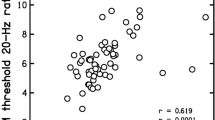 The second class of explanation is that the factors influencing pitch perception and F0 discrimination differ qualitatively between the low and very high frequency regions. For example, Gockel et al.16 have argued that the weak or absent phase locking to the individual components of the high-frequency complex forced listeners to rely on excitation-pattern cues. For the frequency discrimination of an isolated pure tone (a single harmonic), the peak in the excitation pattern produced by that tone might be confused with random peaks in the excitation pattern produced by the background threshold equalizing noise (TEN; see “Methods” section). They argued that for a harmonic complex this confusion would be reduced because of the regular pattern of excitation peaks, leading to a larger decrease in the F0DL than predicted from the FDLs for the individual harmonics, based on an optimum-combination model. It is possible that these confusion effects limited discriminability even for the high-region complex tones used here. Dichotic presentation might lead to a better representation of peaks in the excitation pattern corresponding to the individual harmonics, but there would be fewer peaks within each ear to help resolve confusion, so the net effect might be no benefit. If so, this could account for the absence of a dichotic advantage for the high frequency region. Gockel et al.16 argued that these excitation-pattern confusion effects were less likely to limit performance at low frequencies, where phase locking is stronger, and so the limitations on F0 discrimination performance may well have differed between the two frequency regions. The significant interaction between subject and F0 that was observed here, is therefore also consistent with the explanation that different factors limit F0 discrimination in the low and very high frequency regions.