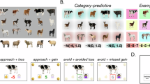 In Phase 1 and 2, each card deck followed a probabilistic reward structure that changed throughout the task (Fig. 1B). Each deck was assigned to initial payout probabilities (\(\pi\), the odds the deck would return a $10 reward, rather than $0) of 60%, 30%, or 10% randomly, without replacement. These payout probabilities then slowly drifted across trials (t) within each context according to a decaying Gaussian random walk with reflecting bounds at 5% and 95% that was centered at the target probability (\({\theta }_{i}\)) assigned to each deck (i)31: