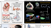 Figure 2B (1)–(4) shows the process of grasping. In Fig. 2B (1), the left and right fingers are opened. In Fig. 2B (2), the robotic hand turns its fingers to a vertical orientation. The surfaces or back side of the fingers are moved to face toward the object using the wrist axis (\({J}_{6}\), Fig. 1D). In Fig. 2B (3), the robotic hand increases the spacing between the right and left fingers to conform to the size of the object. In Fig. 2B (4), the robotic hand moves the surface of the finger closer to the object and the pressure sensor attached to each finger detects contact with the object. The fingers are closed to grasp the object. After the object is grasped, the manipulator lifts or places the object using the shoulder and elbow axes.
