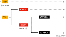 Immunostaining was performed as described previously71,72. Briefly, sections were blocked in 4% normal donkey serum (Sigma, St. Louis, MO), 2% bovine gamma-globulin (Sigma-Aldrich, St. Louis, MO) and 0.3% Triton X-100 (Fisher Scientific) in 0.1 M PBS for 90 min at RT. Next, tissue sections were incubated for 24–36 h at RT with primary antibodies. Sections were washed with PBS from unbound primary antibodies, blocked, and incubated for 90 min at RT with appropriate fluorophore conjugated secondary antibodies (Jackson Immuno-Research, West Grove, PA, USA). Finally, tissue sections were washed for 3 × 5 min with 0.1 M PBS and 2 × 5 min in diH2O, air-dried, and covered with Vectashield Antifade Mounting Medium (Vectorlabs, Burlingame, CA, USA). In this study, the following previously characterized primary antibodies were used: anti-PGP9.5 rabbit polyclonal (Millipore-Sigma; Burlington, NJ, catalog AB1761-I; 1:300)73; anti-Neurofilament H (NF-H) chicken polyclonal (BioLegend; San Diego, CA; catalog 822,601; 1:1000)74; anti-CGRP guinea pig polyclonal (Synaptic Systems; Goettingen, Germany; catalog 414 004; 1:200)75; anti-TRPV1 rabbit polyclonal (Novus Biologicals; Centennial, CO; catalog NBP1-71774SS; 1:200)76; anti-mrgprD rabbit polyclonal (Alamone Lab; catalog ASR-031; 1:200)20,77; anti-CHRNA3 rabbit polyclonal (Bioss; catalog BS-6455R; 1:200)78; anti-tyrosine hydroxylase (TH) chicken polyclonal (Neuromics; Bloomington, MN; catalog CH23006; 1:300)79; anti-smooth muscle actin (α-SMA) Cy3-conjugated rabbit polyclonal antibody (Millipore-Sigma; catalog C6198; 1:500); anti-trkC rabbit polyclonal (Aviva Systems Biology, San Diego, CA; catalog ARP51318_P050; 1:200); anti-trkB goat polyclonal (R&D systems; AF1494; 1:200)80; anti-parvalbumin rabbit polyclonal (Novus Biologicals; catalogue NB120-11427SS; 1:200)81; anti-calbindin D28k rabbit polyclonal (Synaptic Systems; catalogue 214 011; 1:200)82.