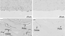 From these OES results, it is clear that adding hydrogen in the APS process has an unavoidable reducing effect on the TiO2 feedstock (and the sub-stoichiometric Ti oxides that first form). It was also found that only small amounts of hydrogen are required to reveal this phenomenon for all the spraying conditions in this work. In fact, to reduce 5 g min−1 of the TiO2 feedstock completely to TiO, only ~ 0.35 slpm H2 would be required, and again the same amount of H2 would be needed to reduce this TiO to Ti. Therefore, it is likely to expect a more reduced TiO2−x coating for Ar–H2 spraying conditions, which further corroborates what is seen in Fig. 3b, as coatings with heterogeneous through-thickness phase distributions are formed.