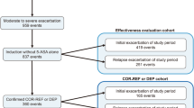 Clinical activity was evaluated by two-item patient-reported outcome (PRO2) extracted from Mayo score10. PRO2-based clinical remission was defined as a stool frequency score of 0 and a rectal bleeding score of 0. Symptomatic remission was defined as a stool frequency score of 0 or 1 and a rectal bleeding score of 011. LOR was defined as disease worsening after primary response to biologic agents, which was evaluated by doctors’ description in medical records. Biologic treatment failure was defined as discontinuation of biologic agents or treatment intensification with other drugs including topical 5-aminosalicylic acid (5-ASA) or corticosteroids for UC due to LOR to biologic agents.
