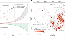 The regression results are presented in Fig. 1. The most fitted estimate is that a = 26.796, xc = − 1.4218 and k = 0.1280 for total carbon, and a = 12.797, xc = − 3.2905 and k = 0.1961 for DOC. The uncertainty range of the parameters is also analyzed. The biggest impact may be caused by parameter a, which changes from 21.336 to 32.256 for TC and 10.607 to 14.987 for DOC under 90% confidence interval. More details about the regression are included in the supplementary file. This regression model was employed to approximate the spatial–temporal variation of carbon flows in provinces of China.