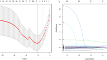 Use several methods for variable screening. (A1) The abscissa represents the numbers of variables inclusion, and the ordinate represents the value of BIC; When the number of variables is 4 or 5, the minimum BIC is − 48.4. (A2) Specific variables included in the model with minimum BIC. (B1) The abscissa represents the numbers of variables inclusion, and the ordinate represents the value of adjusted R-square; when the number of variables is 8, the maximum adjusted R-square is 0.143. (B2) Specific variables included in the model with maximum adjusted R-square. (C1) LASSO coefficient profiles of the features. A coefficient profile plot was produced against the log (lambda) sequence. (C2) Optimal parameter (lambda) selection in the LASSO model used fivefold cross-validation via minimum criteria40. The partial likelihood deviance (binomial deviance) curve was plotted versus log (lambda). Dotted vertical lines were drawn at the optimal values by using the minimum criteria and the 1 SE of the minimum criteria (the 1-SE criteria). BIC Bayesian Information Criterion, LASSO least absolute shrinkage and selection operator, SE standard error.