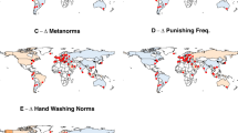 Concerning our second research question—whether social norms of cooperation changed in response to Covid-19—we draw on the tightness-looseness theory of cultures17,23. This influential paradigm of social norm change posits that societies that have experienced more frequent and stronger ecological and social threats—e.g., frequent disease, warfare, and environmental catastrophes—throughout their histories have developed tighter cultures with stronger social norms and low tolerance of deviant behaviour to maintain order and survive crises. In contrast, low threat histories produce loose cultures with weak social norms and a high tolerance for norm-breaking17. Hence this theory implies that social norms supporting behaviour will be stronger after the emergence of the Covid-19 pandemic. While this is an established theory supported by rich empirical research, nearly all of the existing evidence comes from cross-sectional country-level or regional-level comparisons that may suffer from issues of confounding17,23,24,25,26 (but see27,28,29,30 for exceptions that look across time). Causal evidence that social norms and cooperation change in response to threats is scarce.
