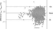 To assess the agreement between core temperature measure with the PAC, the SpotOn, and bladder temperature catheter we used the Bland–Altman random-effects approach for data of repeated measures7. Bland–Altman plots were used as a primary statistical method to interpretation of accuracy (bias = mean difference methods) and precision (limit of agreement = 1.96 standard deviation).