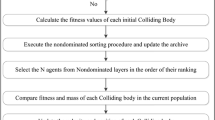 According to the above-mentioned fast non-dominated sorting method, the particles can be accurately classified into multiple ranks with different levels. Among them, \(F_{1}\) is the Pareto optimal solution, and the particle quality in this rank is the best. With the increase of \(rank\) in \(F_{rank}\), the quality of the particles in the corresponding rank becomes worse. Although fast non-dominated sorting can be used to sort particles according to their mass, there is a high probability that multiple particles will appear at the same level of \(F_{rank}\). The quality of these particles can no longer be distinguished, so the NSCSO cannot smoothly assign the role to each particle. This problem is solved with the introduction of the crowding degree strategy. The strategy sets a predefined distance for the particles in different Ranks, calculates the distance of each nearest particle within the preset distance, and then performs a normalization process as its crowding degree. In this way, particles of the same rank can be further sorted according to the degree of congestion. The calculation formula of crowding degree is shown in Eq. (16).