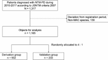 This retrospective study was conducted by evaluating patients’ medical records. Patients who were admitted to our hospital between 2003 and 2019, who met the 2020 diagnostic criteria established by the American Thoracic Society/European Respiratory Society/European Society of Clinical Microbiology and Infectious Diseases/Infectious Diseases Society of America, and for whom cultures were positive for MAC were included in the study10. The exclusion criteria were as follows: patients who had undergone surgery for MAC-PD, those with additional microbial infections other than MAC disease, and those with missing data required for the score assessment, which is a scoring system involving calculations based on the body mass index, age, presence of cavities, an elevated erythrocyte sedimentation rate, and sex, and reflects disease progression and mortality11,12. The included patients were divided into two groups. The multidrug therapy group included patients who received clarithromycin, ethambutol, and rifampicin for at least 1 year (including patients concomitantly treated with quinolones or aminoglycosides). The observation group included all the remaining patients.