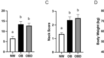 For most analyses, a single sample from each mare (NW, n = 6; OB, n = 7, and OBD, n = 6) was included. However, western blots were performed on granulosa cells from five individual mares per group. Lipidomics of oocytes and cumulus cells included five mares from NW, as one mare in NW was consistently considered an outlier based on ROUT test. GraphPad Prism 9.3.1 was used. Continuous data were analyzed for normality by Shapiro–Wilk tests. Repeated body weight, BCS, percentage body fat, and cresty neck score measures were analyzed within and among groups by two-way ANOVA with post-hoc Tukey’s multiple comparison tests. One-way ANOVA with post-hoc Tukey’s multiple comparison tests were used to compare normally distributed data sets. Kruskal–Wallis tests, followed by Dunn’s multiple comparison tests were used for data that failed normality. Values of P < 0.05 were considered significant, and P ≤ 0.1 was considered tending toward significance. Results are presented as mean ± SEM.