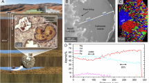 Our chemical analyses reveal the release and transport of Ca, Mg and Sr with a leaching peak at 48 h during the open system mode (Fig. 5A–C). After 48 h, the concentrations of these elements in the open system were reduced by around 2–3 times. In contrast, the concentrations in the closed system mode became systematically higher compared to the open system (Fig. 5A–H). It is important to highlight that releasing elements (leaching), such as Ca and Mg, limits the effective CO2 mineralization in basalt4. Our results also indicate that carbonic acid hydrolysis and leaching of basalt were effective and fast (48 h). Only Fe showed long times for leaching (after 288 h, Fig. 5E), possibly because Fe-rich minerals (i.e., oxides and olivine) have slower leaching ratios when compared to Ca- and Mg-rich minerals (i.e., plagioclase and clinopyroxene)29. Another hypothesis is that the higher Fe concentrations recorded during the later phases do not necessarily result from slow dissolution kinetics. Instead, the Fe-rich phases may have either become more accessible to reaction during the latter stages of the experiment or were equally reactive during earlier stages, but secondary mineralization incorporated the dissolved Fe effectively such that Fe concentrations were relatively low during the earlier stages. It is still possible that Ca- and Mg-rich minerals were dissolved to the same degree during the later stages. Still, their lower concentrations during these stages may result from more effective secondary mineralization at this time. Additionally, it is also possible that secondary mineralization that incorporated Ca and Mg was sluggish initially but improved significantly as more nucleation sites became more prevalent throughout the basalt. Indeed, different dissolution and precipitation processes can occur as the fluid percolates through the basalt grains3,5,6. Lastly, an important fact is that on the 18th day, the experiment lost pressure (decompression from 1.0 to 0.5 bar) and, as a direct result, the removal of elements from basalt by carbonic acid was reduced, indicating that the dissolution of basaltic reservoirs increases with pressure (Supplementary Data 1).