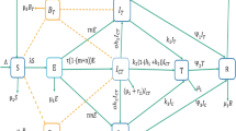 where \(\psi _{{\textbf{T}}}=\frac{\alpha _{1}}{{\textbf{N}}(\tau )}\big ({{\textbf{I}}}_{{\textbf{T}}}(\tau )+{{\textbf{I}}}_{{\textbf{T}}{\textbf{C}}}(\tau )\big )\) and \(\psi _{{\textbf{C}}}=\frac{\alpha _{2}}{{\textbf{N}}(\tau )}\big ({{\textbf{E}}}_{{\textbf{C}}}(\tau )+{{\textbf{I}}}_{{\textbf{C}}}(\tau )+{{\textbf{L}}}_{{\textbf{T}}{\textbf{C}}}(\tau )+{{\textbf{I}}}_{{\textbf{T}}{\textbf{C}}}(\tau )\big ),\) containing positive initial conditions (ICs) \({{\textbf{S}}}(0)\ge 0,~{{\textbf{L}}}_{{\textbf{T}}}\ge 0,~{{\textbf{I}}}_{{\textbf{T}}}\ge 0,~{{\textbf{E}}}_{{\textbf{C}}}\ge 0,~{{\textbf{I}}}_{{\textbf{C}}}\ge 0,~{{\textbf{L}}}_{{\textbf{T}}{\textbf{C}}}\ge 0,~{{\textbf{I}}}_{{\textbf{T}}{\textbf{C}}}\ge 0,~{{\textbf{R}}}\ge 0.\)