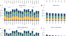 Data for silica mining, industrial silicon production and MG-Si can be found in databases such as USGS3 and Ecoinvent LCA26. SoG-Si production is recognized as a more energy-intensive process than MG-Si due to the purity levels of silicon required for PVs technologies. Data for the LCA of manufacturing processes is available via the GREET model25 and other technical reports38,39,40. Table S1 in the supplementary Information (#2) provides details of the dynamic model and data sources used. The global model of the silicon supply chain has been previously outlined in Golroudbary et al.28. Accordingly, the “direct” energy (i.e., energy required to process one tonne of silicon at each supply chain stage) and the “indirect” energy (i.e., the upstream energy needed for the fuel and power flows) were considered in the model via Eq. 7, which calculates the total cumulative amount of energy consumed in silicon flows.