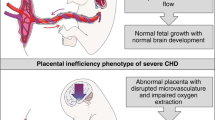The fetal heart and placenta are both embryological fetal vascular organs, with shared expressed gene pathways21,22. It is plausible that placental vasculature may also be disrupted in fetal CHD, although the mechanisms remain unclear23. Recently, focus has shifted to the “heart-brain-placenta axis”24,25,26,27,28 to improve our understanding of the impaired brain and placental development seen in CHD. For example, there was a trend towards more severe brain injury in neonates with CHD when placental pathology was present13 and individuals with both CHD and placental abnormalities have significantly lower cognitive and motor performance scores in early childhood29, although understanding the exact relationship between these factors is complex.