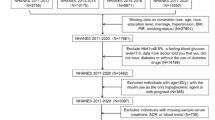 eGFR and ACR were used to assess renal function. eGFR was calculated using calibrated serum creatinine (Scr) according to the chronic kidney disease epidemiology collaboration (CKD-EPI)15. For males, when Scr ≤ 0.9 mg/dL, \(e\text{GFR}=141\times {(\text{Scr}/0.9)}^{-0.411}\times {(0.993)}^{\text{Age}}\); when Scr > 0.9 mg/dL, \(\text{eGFR}=141\times {(\text{Scr}/0.9)}^{-1.209}\times {(0.993)}^{\text{Age}}\). For females, when Scr ≤ 0.7 mg/dL, \(\text{eGFR}=144\times {(\text{Scr}/0.7)}^{-0.329}\times {(0.993)}^{\text{Age}}\); when Scr > 0.7 mg/dL, \(\text{eGFR}=144\times {(\text{Scr}/0.7)}^{-1.209}\times {(0.993)}^{\text{Age}}\). eGFR < 60 mL/min/1.73m2 or ACR ≥ 30 mg/g was defined as CKD as dichotomous outcome variables.