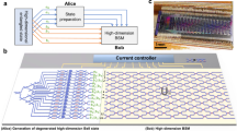Figure 3a depicts the illustration of the two-dimensional array implementation of the surface code. Data qubits are denoted by open circles \((\circ )\), and measurement qubits are represented by solid circles \((\bullet )\), with measure-Z qubits in green (dark) and measure-X qubits in orange (light). In the interior, each data qubit interacts with four measure qubits, while each measure qubit contacts four data qubits, performing four-terminal measurements. At the boundaries, measure qubits interact with only three data qubits, conducting three-terminal measurements, and data qubits connect with either two or three measure qubits. The solid line demarcating the array outlines its boundary. Figure 3b is the depiction of the geometric sequence of operations (left) and the corresponding quantum circuit (right) for one surface code cycle involving a measure-Z qubit. This process stabilizes \({\hat{Z}}_{a},{\hat{Z}}_{b},{\hat{Z}}_{c},{\hat{Z}}_{d}\). Figure 3c is the configuration and quantum circuit for a measure-X qubit, responsible for stabilizing \({\hat{X}}_{a},{\hat{X}}_{b},{\hat{X}}_{c},{\hat{X}}_{d}\). The two identity operators \({\hat{I}}\), which signify waiting periods, are incorporated in the measure-Z process, aligning the timing with that of the measure-X qubit. The latter undergoes two Hadamard \({\hat{H}}\) operations, with the identity operators positioned at the sequence’s outset and conclusion to minimize the impact of errors during these crucial steps.