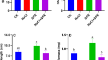 Although shoot growth at various salinity profiles of the germination media was productively maintained, root growth was gravely impacted throughout the trials (Fig. 9). Although root growth was not very productive even in the case of Adj1/ADJ6 bacterization over wheat seeds, remarkably significant rescue could be accorded to the consortium-(ADJ1 + 6)-assisted treatments (Fig. 9a, and Supplementary Fig. 3b). The latter synergistic PGP effect of the consortium on the wheat seedling roots can be easily witnessed at the 50- and 100-mM salinity regime, probably this partly rescues the plant stature under stress. This prospect could be useful for application in crop biotechnology, as it is known that at 50–100 mM salinity in soil substratum (5–10 dsm−1), wheat productivity is deleteriously reduced. Elevated salinity levels postpone the initiation of seedling germination, diminish both the growth of seedlings and the spread of germination occurrences, as well as influence seedling metabolism97,98,99,100. Various physiological parameters, viz., total chlorophyll, carotenoids, phenols, flavonoids, and proline, assessed in our salinity stress trials over bacterized wheat seeds show that at every higher salt concentration, detriment from salinity stress was kept under profound check comparatively to that seen under control treated wheat seeds (Supplementary Fig. 3c–i). The above results with wheat plants and the notion of bacterial tolerance to moderate salt (up to 4%) have promiscuously intrigued several field-based trials using salt regimes in experimental soils and those from various regions with high salinity portfolios. These trials are further being carried out at our end.