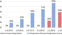 Previous research has indicated similar results in misalignment from intended implantation axis and visual outcomes between toric IOL implantation using a femtosecond laser and conventional phacoemulsification43,44,45. In the current study, all patients underwent femtosecond laser-assisted cataract surgery, and the refractive outcomes were comparable to those of a previous investigation on Eyhance Toric II IOL implantation with manual capsulorhexis, which reported refractive cylinder of ≤ 0.50 D in 84% and ≤ 1.00 D in 95% of patients at 3 months postoperatively8.