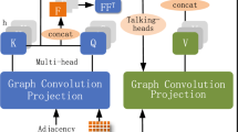 The shape of the skeleton data is \(x\in {R}^{C\times V\times T}\), C represents the x, y, z coordinates, V denotes the number of joints and T is the length of the skeleton sequence. To convert the skeleton data into d-dimensional feature vectors, a trainable matrix conv is introduced to transform the skeleton data into \(\text{x}\in {\text{R}}^{\text{d}\times \text{T}}\), elements in the trainable matrix can be regarded as initial weight values. They are optimized through back propagation. The dot product of each generated feature vector is divided by \(\sqrt{\text{d}}\), and we can get the final weighted values using softmax. Expression for Ck is shown in Eq. (4). The value of variance of each element in Ck depends on d, thus pushing softmax function into the area with minimal gradient. To counteract this effect, we scale the dot products by \(\frac{1}{\sqrt{d}}\).