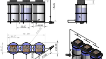 The aquaculture units consisted of nine fish tanks (F 1–9, water volume 1 m3; Fig. 4) arranged in triplicates (3 × 3) for staggered fish production of three different fish weight classes, one solids separation unit / sedimenter (Se-E in EAU: 1.1 × 1.2 × 0.9 m and 1.2 m3; Se-I in IAU: 1.5 × 1.3 × 0.9 m and 1.7 m3), nitrifying trickling filters (TF-E in EAU: 2.9 m3; TF-I in IAU: 11.8 m3), and communicating sumps (S-E in EAU: 1.6 m3; S-I in IAU: 4.0 m3)7. Aquaculture process water was transferred semi-continuously via a water management system and tanks (WT-E-1/2 in EAU and WT-I-1/2 in IAU approx. 1,500 L) into the hydroponic cabin with corresponding aquaculture tanks for the EAU (AET-E), IAU (AET-I), and an additional hydroponics control group tank (Control) with a fertiliser solution (each approx. 1,000 L). For semi-coupled aquaponics conditions, nutrient solutions were pumped back from the hydroponics unit via water management system to the extensive and intensive aquaculture units twice a week.