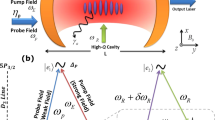 Figure 1 shows the schematic of a four-level inverted-Y atomic system that is excited by a probe laser field, a coupling laser field and a signal laser field. The atom is placed in a longitudinal magnetic field B parallel to the propagation direction of the laser fields that removes the degeneracy of the ground-state sublevels, where the magnetic field B shifts mF = ± 1 levels by ± ΔB via the Zeeman effect. The left-circularly polarized probe field with Rabi frequency Ωp and angular frequency ωp drives the transition |1〉 (mF = + 1) ↔|3〉 (mF = 0). The right-circularly polarized coupling field with Rabi frequency Ωc and angular frequency ωc is applied to the transition |2〉 (mF = − 1) ↔|3〉 (mF = 0). The levels |3〉 (mF = 0) and |4〉 (mF = 0) are connected by the linearly polarized signal field with Rabi frequency Ωs and angular frequency ωs. The Zeeman shift of levels |1〉 and |2〉 is given by Ref.27 \(\hbar \Delta_{B} = \mu_{B} m_{F} g_{F} B\) where \(\mu_{B}\) is the Bohr magneton, \(g_{F}\) is the Landé factor. The spontaneous decay rate from the upper state to the lower state is denoted by γij.