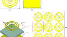 The front and back views of the proposed unit cell design layout are shown in Fig. 1a and b. Additionally, Fig. 1c displays the design layout of the 3 × 3 array structure. The unit cell consists of a split ring resonator (SRR), two strip lines, and two split strip lines. The strip lines that connect the ring's edges are the same width. The inner split strips, which have the same widths, are connected to the middle of the ring resonator. The resonators are made of annealed copper, with a thickness of 0.035 mm and a conductivity (σ) of 5.8 × 107 S/m. The split gaps are connected to the lumped elements (resistive loads), specifically R1, R2, and R3. The proposed unit cell has an overall size of (10 × 10) mm2, while the 3 × 3 array structure has a size of (30 × 30) mm2. Compared to other designs documented in the literature, the proposed one is comparatively smaller. Furthermore, the split ring resonator's 45° inclination is another distinguishing characteristic of the design, significantly enhancing its bandwidth.