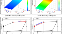 where the subscript 0 represents the reference state; \({\mathbf{C}}_{{{\text{dr}}}}\) is the elastic tensor; \({\mathbf{I}}\) is the equivalent tensor;\(p\) is the fluid pressure, MPa. \(\rho_{{\text{g}}}\) indicates shale gas density, kg/m3; \(m\) represents fluid mass per unit bulk volume, kg/m3; \(\varepsilon_{{\text{v}}}\) is the volumetric strain, \(\varepsilon_{{\text{v}}} = {\text{tr}}\left( \varepsilon \right)\); \(b\) is the Biot coefficient, \(b = 1 - \frac{{K_{{{\text{dr}}}} }}{{K_{{\text{s}}} }}\); \(M\) represents the Biot modulus, and there is relationship of \(\frac{{1}}{M} = \phi_{{\text{m}}} c_{{\text{g}}} + \frac{b - \phi }{{K_{s} }}\); \(K_{{\text{s}}}\) is the bulk modulus of rock, MPa;