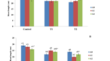 All growth parameters of FSD-08 and PUNJAB-11 are affected by 120 mM salt stress in control, but biochar treatment ameliorate the effect of salinity and plant growth much better. The Mean values of all the growth parameters with SE (Standard Error) represented as bar graphs. Plants root fresh weight and dry weight decreased with increasing in salt stress relative to control. On the other hand, at a significant level biochar caused to increase in root fresh and dry weight relative to control under conditions of saline and non-saline. Graph showed level (120 mM) of NaCl reduced root fresh and dry weight in both varieties, but the major effect is on PUNJAB-11. As interaction of biochar and salt stress, the biochar caused to mitigate salinity impact on root fresh and dry weight significantly (P < 0.001) (Fig. 1). In Contrast to control, reduced root length observed under salt stress treatment. This reduction was significant (P < 0.05). Significantly (P < 0.001), NaCl treatment reduced root length in both varieties of wheat. Relative to control biochar application enhanced root length at P < 0.05 significant level. The impact of NaCl and biochar amendment showed significant results on both varieties of wheat (P < 0.001) (Table 1, Fig. 1).