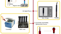 The coefficient of variation (CV) was calculated for both oil(A) and oil(B) IFT data. CV for oil(A) data was 5.36, however, it was 0.92. The big difference in this parameter shows that the IFT of the first oil sample varies in different water compositions, but the IFT for the second sample is not intensely sensitive to the water composition. The data in Table 4 illustrate that the reduction in water salinity reduces the concentration of divalent cations, making a slight decline in the IFT value. This reduction is more noticeable when oil(A) is used. So, using Na10LSW reduces the IFT value from 41.4 to 36.3 mN/m. The effective mechanism of this IFT reduction is EDL expansion. The total acid number (TAN) in the Oil(A) sample is high due to acidic functional groups. Thus, the oil droplets' EDL expands with the reduction in the bulk water salinity. EDL Expansion results in a repulsive force between oil droplets, which makes them smaller and thus lowers the oil–water IFT48,49. Also, oil's acidic functional groups are slightly soluble in water50. Decreasing the salinity of water and the components dissolved in it increases their solubility, resulting in IFT reductions. However, the reduction of IFT in oil (B) is meager. This is due to the absence of acidic functional groups in this oil sample, and the brine/oil IFT value in this complex is not dependent on water salinity. It should be noted that IFT reduction is not a primary mechanism in low salinity water flooding, and wettability alteration and fine migration phenomenon are much more effective than IFT reduction.