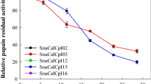 SnuCalCpI15 was heterologously expressed in E. coli as described previously (Kwon et al. 2022a). The cDNA was synthesized using a PrimeScript™ First-Strand cDNA Synthesis Kit (Takara, Otsu, Japan) using total RNA extracted from lyophilized young leaves of C. procera. A partial cDNA fragment encoding a putative I29 domain was separated from the C1A domain of SnuCalCp15 and inserted into the vector pET29b(+) for expression in E. coli BL21 (DE3) Star (Invitrogen, Carlsbad, CA, USA). Expression was induced using 0.5 mM IPTG after the cells had reached the mid-exponential phase, followed by continuous shaking at 18 °C for 16 h. Cell lysates were prepared by probe sonication (10 s pulse, 10 cycles, and 35% power) of the harvested cells. The lysates were centrifuged at 12,000 g for 20 min and the supernatant was dialyzed against 50 mM Tris-HCl (pH 8.0) for 12 h at 4 °C. His-tagged SnuCalCpI15 was purified on a column pre-packed with QIAexpress Ni-NTA Agarose (Qiagen, Hilden, Germany). The protein was ultra-filtrated with 50 mM phosphate-buffered saline (PBS; pH 7.4) and filter-sterilized prior to its use.