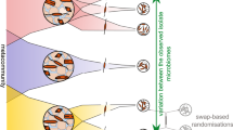 To quantify the degree of phylogenetic clustering in a single community we used the NTI metric7. To estimate NTI, we first generated 1000 null communities by randomising population labels across the phylogenetic tree tips and calculated the mean nearest taxon distances (MNTD) for each null community. The randomisations were performed using the function ses.mntd() from the picante package19 (version 1.8.2). The randomisation generates stochastically assembled communities (i.e. null communities). NTI was then calculated as the difference between the mean phylogenetic distance of the null communities (mean MNTDnull) and the observed phylogenetic distance between co-occurring populations in a community (MNTDobserved), divided by the standard deviation of the null distribution of MNTDnull. NTI values greater than zero indicate phylogenetic clustering (i.e. populations are more closely related than expected by chance). Conversely, values less than zero indicate phylogenetic overdispersion (i.e. populations are more distantly related than expected by chance). A two-standard deviation is considered significantly different from the null model, and as such NTI <-2 or NTI > 2 is assumed to reflect deterministic community assembly processes.