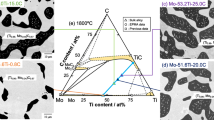 Figures 3, 4 and 5 show regions containing α, β, and TiB. Figure 6 shows the chemical composition variation for all phases across the samples, it can be seen that there is a slight reduction in Ti in α- and β-phases after additions of B4C, from a maximum of 88.7 at% in α-phase and 86.5 at% in β-phase in B4C_0 to 86.8 at% in α-phase and 83.1 at% in β-phase in B4C_3. Additionally, α-phase becomes enriched in TiO by 1.7 at% and β-phase in Mo by 1.6 at%. Low concentrations of C and B are found in these phases. TiB is slightly off-stoichiometry with 40 at% of B and low concentrations of Mo and Nb. Si and P segregate to the α/TiB interface13. In B4C_1.5 (Fig. 4), the concentration of Ti in α-phase is lower than B4C_0.5, while Al and TiO are higher. The concentration of TiO is twice as high when compared to B4C_0. The composition of TiB remains stable in B4C_0.5 and B4C_1.5, with slightly higher concentrations of minor elements compared to TiB in B4C_0.5.
