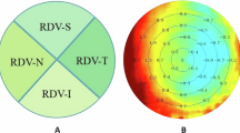 Before the study, well-trained optometrists and ophthalmologists performed routine ocular examinations to ensure the eye health of each participant and ascertain refractive status. Steep keratometry (Ks), flat keratometry (Kf), and average keratometry (Ave-K) were performed using a topographic modeling system (TMS-4; Tomey, Japan). Intraocular pressure (IOP) was measured using a non-contact tonometer (CT-800; TOPCON Co., Japan). AL and central corneal thickness (CCT) were measured using Haag-Streit diagnostics (LS900, Haag-Streit AG, Switzerland). RDV was measured using multispectral refractive topography (MSIC2000, ShengDa TongZe, Shenzhen, China) and recorded in five retinal eccentricity ranges: 0–10°, 10–20°, 20–30°, 30–40°, and 40–53° (RDV0–10, RDV10–20, RDV20–30, RDV30–40, and RDV40–53, respectively; Fig. 1A). Defocus values were recorded for the four sectoral quadrant regions of the retina (Fig. 1B)—temporal (RDV-T), inferior (RDV-I), superior (RDV-S), and nasal (RDV-N). The retinal RDV in the total range (0–53°) of the macular fovea centralis was recorded as total RDV (TRDV). Positive values were used to denote hyperopic defocus RDVs, and negative values were used to denote myopic defocus RDVs. Furthermore, 0.5% tropicamide was administered to induce cycloplegia, and the refractive power was measured using computerized optometry and subjective refraction. The SE was calculated as SE = dioptre sphere + 1/2 dioptre cylinder.