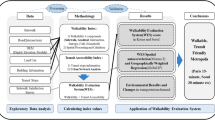 Objective evaluation systems for street walkability are multi-attribute frameworks that include indicator selection, variable processing, and weighting and aggregation27. Nearly 200 different indicators have been used in urban street walking environment studies28,29. Many focus on community-level elements, with the most typical being the “D” indicators. Robert Cervero et al. proposed the 3D model—Density, Diversity, and Design—in 1997, noting these indicators’ significant influence on travel frequency and mode30. Ewing expanded this to a 5D model by adding destination accessibility and distance to transit31, and further to a 7D model by including demand management and demographic attributes32.