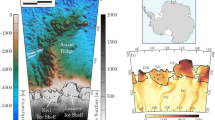In the Antarctic Peninsula (R2–R3), the bathymetry of Larsen C (46,465 \(\hbox {km}^{2}\) in size) and D (22,548 \(\hbox {km}^{2}\)) reveals a deeper bed with previously unknown channels on the continental shelf. Subglacial valleys up to 1000 m deep and 200–400 m deeper than IBCSOv2 are found in Whirlwind and Mobil Oil Inlets (Fig. S7b). On Larsen D, the bathymetry is up to 600 m deeper than IBCSOv2 with an east-west trough at 1200 m depth along Wilkins coast. The new bathymetry is 98 ± 176 m deeper on average. We fit seismic data45 within 2 ± 44 m. Beneath Wilkins Ice Shelf in R3, the bathymetry is up to 600 m deeper than IBCSOv2 and 650 m deeper beneath Stange Ice Shelf (Fig. 3). For George VI Ice Shelf (23,434 \(\hbox {km}^{2}\)), the bathymetry is 57 ± 133 m deeper than prior inversions46 (Table S1). We fit seismic data within 4 ± 43 m47 (Fig. S7c).